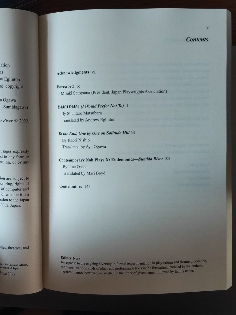 My translation of the play YAMAYAMA (I Would Prefer Not To), written by Matsubara Shuntaro in 2018, appears in Volume 8 of the ENGEKI: Japanese Theatre In the New Millennium series, published by the Japan Playwrights Association (JPA), pp. 1-52.